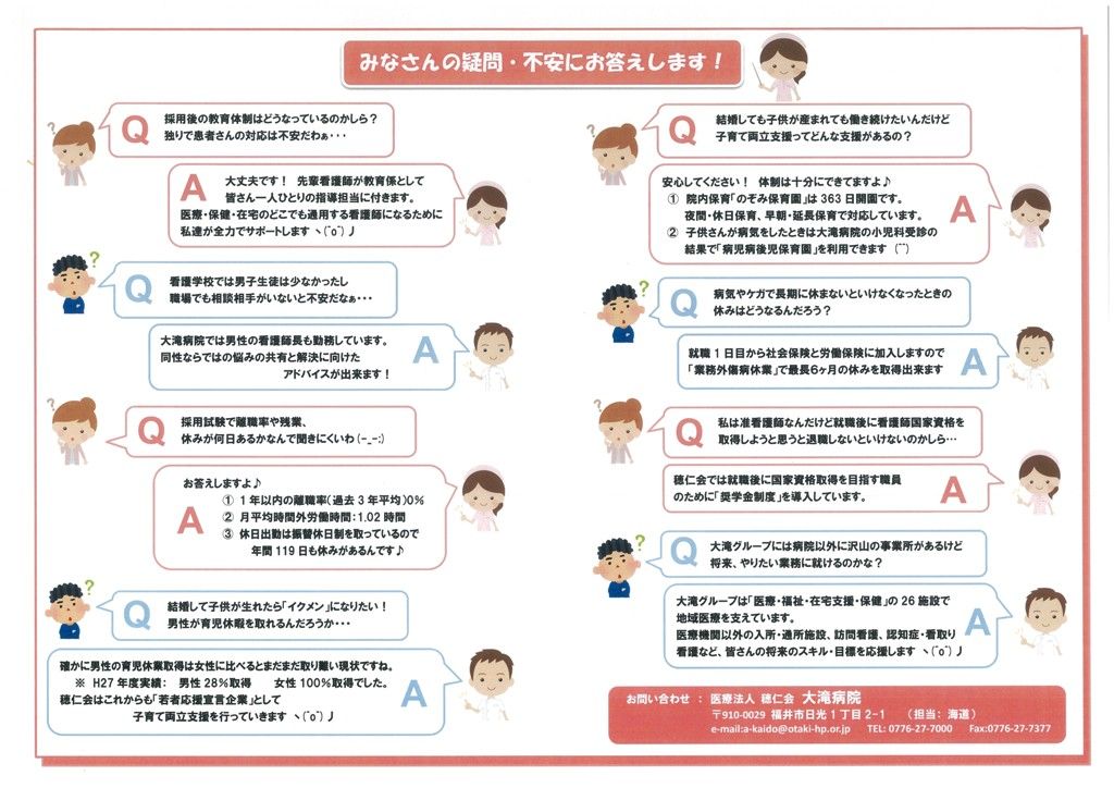 2019年03月08日 現在2020年度の新卒者採用を募集しています。下記担当者までお問い合わせください。 みなさんの疑問・不安にお答えします〒910-0021 福井市乾徳4丁目5-8 TEL : 0776-27-7000 FAX : 0776-27-7377E-mail:a-kaido@otaki-hp.or.jp 担当/海道