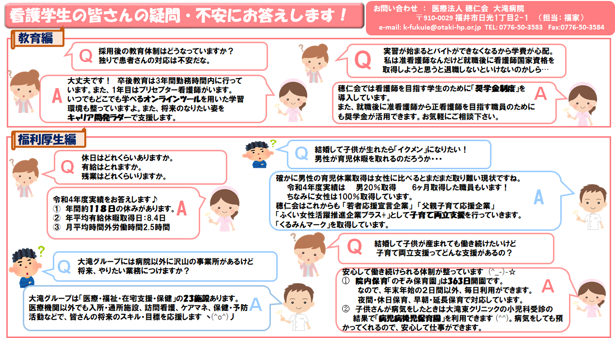 2023年04月13日 現在2024年度の新卒者採用を募集しています。下記担当者までお問い合わせください。 みなさんの疑問・不安にお答えします〒910-0021 福井市乾徳4丁目5-8 TEL : 0776-50-3583 FAX : 0776-50-3584E-mail:k-kitaoka@otaki-hp.or.jp 担当/北岡