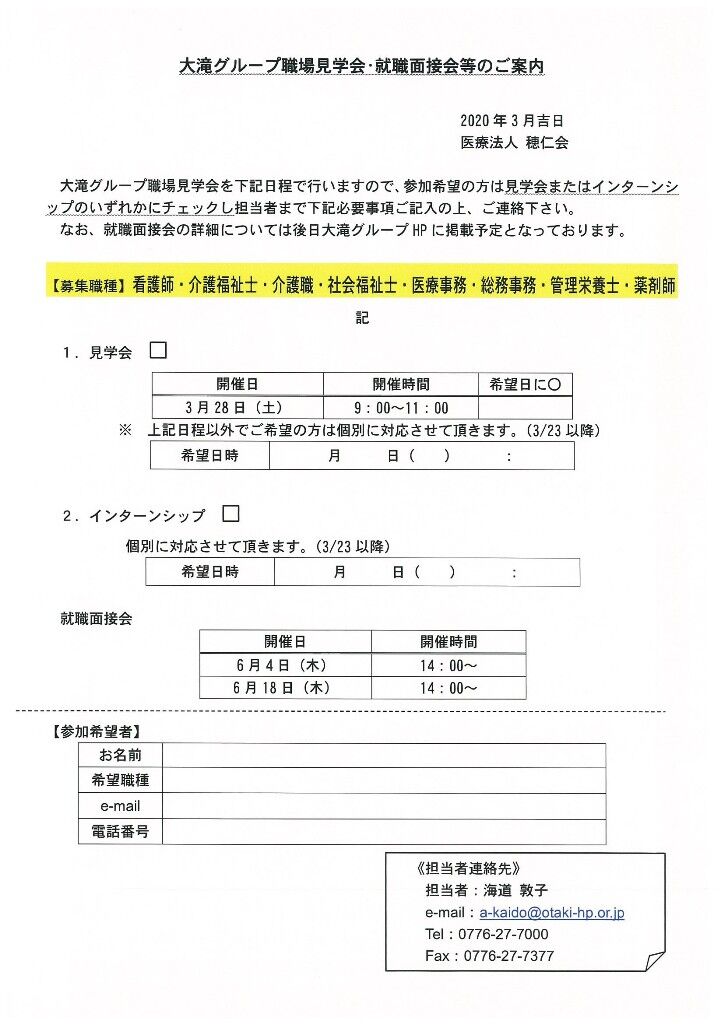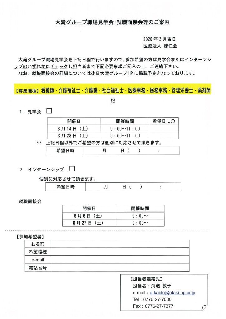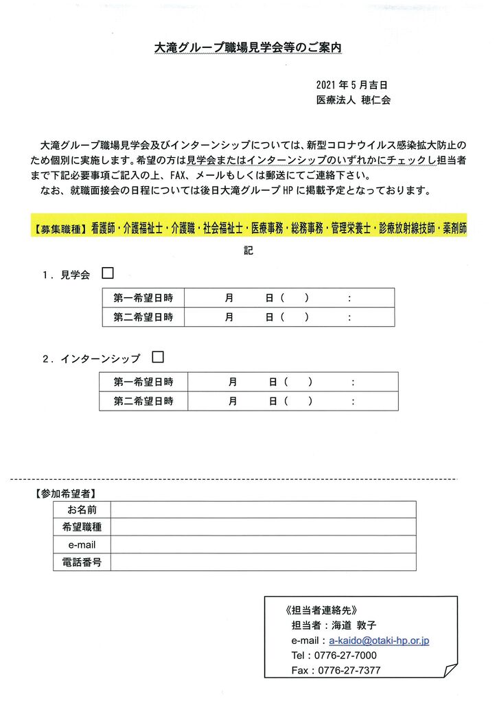 大滝グループ職場見学会を下記日程で行いますので、参加希望の方は担当者まで下記必要事項記載の上、ご連絡下さい。