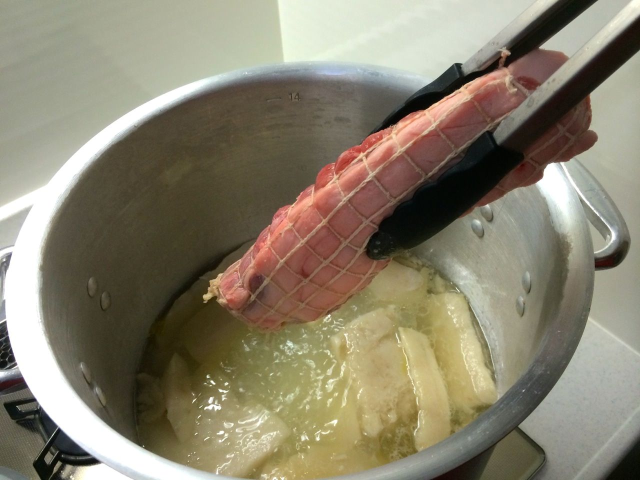 水は5リットル、これにゲンコツを火を入れる前に投入し少しづつ煮立たせます