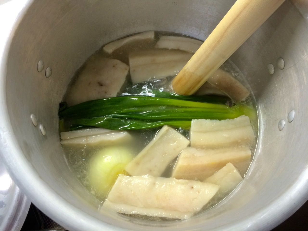 この後 総計約5時間煮出し、だいぶ生姜の香りがついてきたので長葱・生姜を取り出します