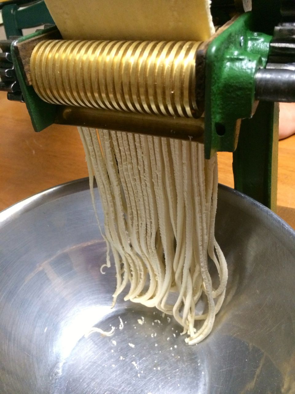 ラップをかけて、スープの具合確認やらニンニクみじん切りとかキャベツのザク切りとかしながら2〜3時間の麺帯熟成後、いよいよ麺切り!