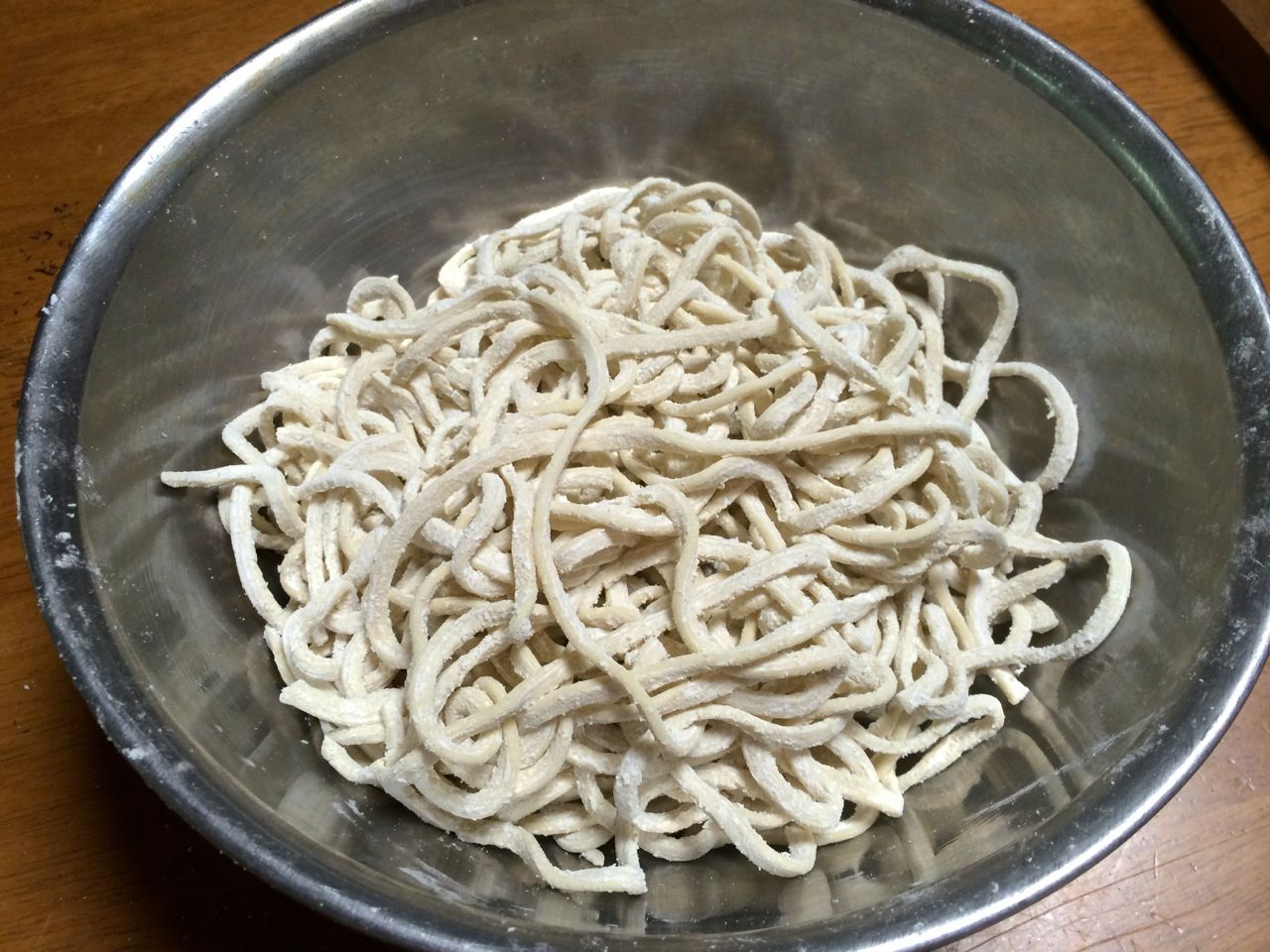 前日はスープの下ごしらえをしながら、My 小野式の慣らしというかレストア後の余分な汚れを取るために350g程度で麺帯製造〜麺切りまで最終清掃兼、試し打ちをしてみています。(加水率34%、かんすい不使用)