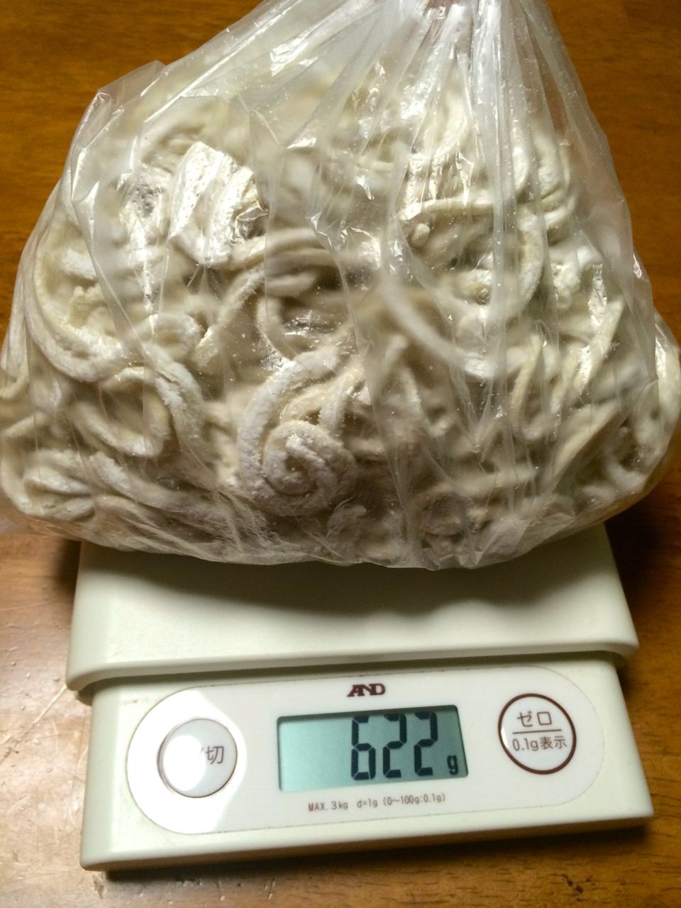オーション:500g+かんすい混合水:170g=670g(要するに加水率34%)なので、切り屑になったやつとか50gくらいでしょうか?減った量、想像より少ないかな