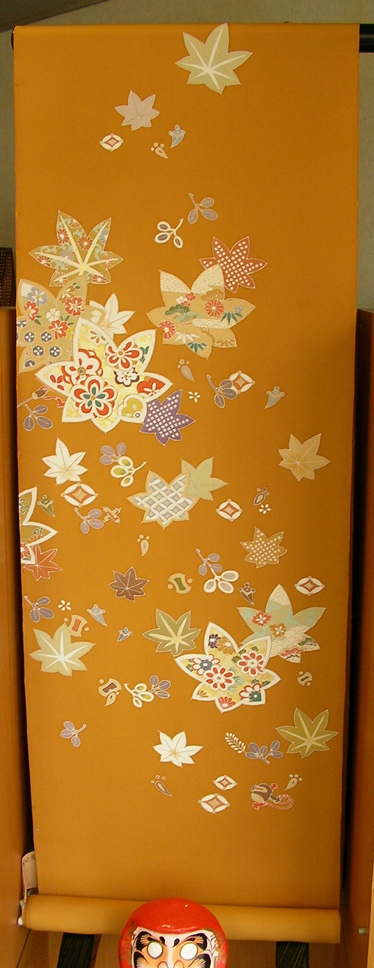 これに対して仮絵羽は、背中を向けた状態で衣桁(いこう)にかけて展示されてます。絵羽文様(えばもよう/もんよう)という