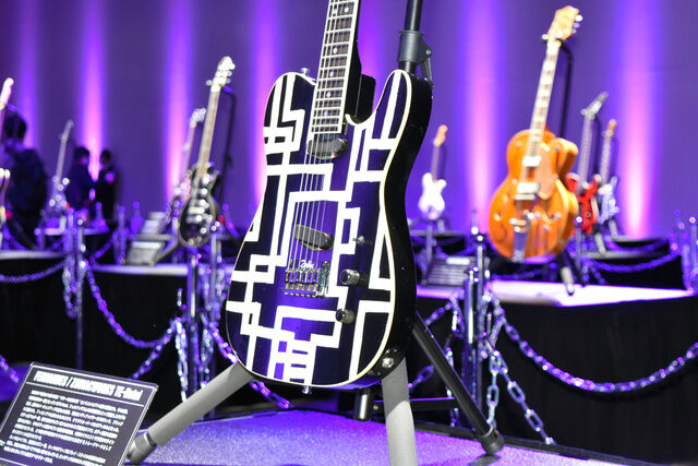 愛用の40本を展示。約2分間のビデオメッセージで、布袋さんは「僕も群馬県出身のアーティストとして、Gメッセでたくさんの伝説を