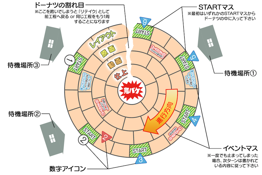 とあるTVアニメの納品を目指して奮闘する、ドーナツ型ボードゲームです。