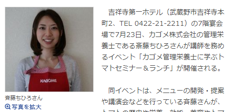 吉祥寺第一ホテルの7階宴会場で7月23日、カゴメ株式会社の管理栄養士である斎藤ちひろさんが講師を務めるイベント「カゴメ管理栄養士に学ぶトマトセミナー&ランチ」が開催される。