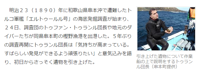 明治23年に和歌山県串本沖で遭難したトルコ軍艦「エルトゥールル号」の海底発掘調査が始まり、24日、調査団のトゥファン・トゥランル団長や地元のダイバーたちが同県串本町の樫野漁港を出港した。5年ぶりの調査再開にトゥランル団長は「気持ちが高まっている。すばらしい発見ができるよう頑張りたい」と意気込みを語り、初日からさっそく遺物を引き上げた。今後は水中ポンプの設置作業を進め、調査は2月半ばまで行う予定。