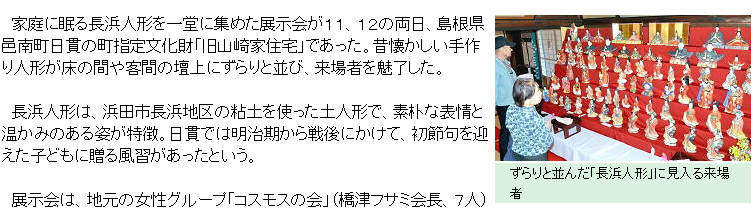家庭に眠る長浜人形を一堂に集めた展示会が11、12の両日、島根県邑南町日貫の町指定文化財「旧山崎家住宅」であった。昔懐かしい手作り人形が床の間や客間の壇上にずらりと並び、来場者を魅了した。