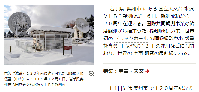 国立天文台水沢VLBI観測所が16日、観測成功から120周年を迎える。国際共同観測事業の緯度観測から始まった同観測所はいま、世界初のブラックホールの画像撮影や小惑星探査機「はやぶさ2」の運用などにも関わり、世界の宇宙研究の最前線にある。