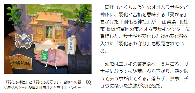 国蝶のオオムラサキをご神体に、羽化と合格を意味する「受かる」をかけた「羽化る神社」が、北杜市オオムラサキセンターに登場した。サナギが羽化した後の羽化殻を入れた「羽化るお守り」も販売されている。