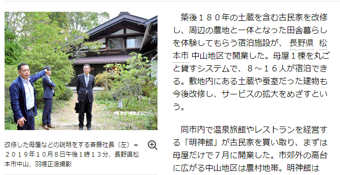 築後180年の土蔵を含む古民家を改修し、周辺の農地と一体となった田舎暮らしを体験してもらう宿泊施設が、長野県松本市中山地区で開業した。母屋1棟を丸ごと貸すシステムで、8~16人が宿泊できる。敷地内にある土蔵や蚕室だった建物も今後改修し、サービスの拡大をめざすという。