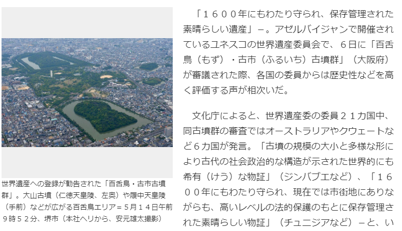 アゼルバイジャンで開催されているユネスコの世界遺産委員会で、6日に「百舌鳥・古市古墳群」が審議された際、各国の委員からは歴史性などを高く評価する声が相次いだ。