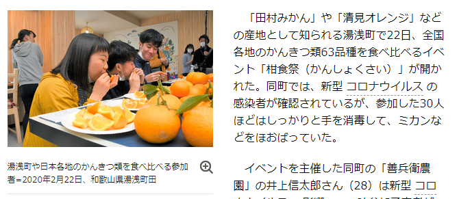 「田村みかん」や「清見オレンジ」などの産地として知られる湯浅町で22日、全国各地のかんきつ類63品種を食べ比べるイベント「柑食祭」が開かれた。同町では、新型コロナウイルスの感染者が確認されているが、参加した30人ほどはしっかりと手を消毒して、ミカンなどをほおばっていた。