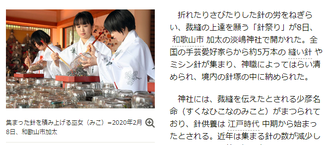 折れたりさびたりした針の労をねぎらい、裁縫の上達を願う「針祭り」が8日、淡嶋神社で開かれた。全国の手芸愛好家らから約5万本の縫い針やミシン針が集まり、神職によってはらい清められ、境内の針塚の中に納められた。