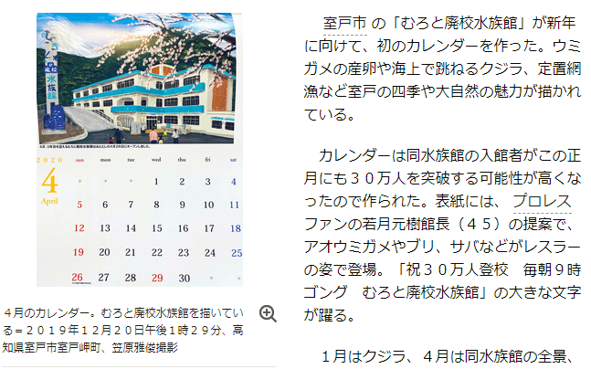 「むろと廃校水族館」が新年に向けて、初のカレンダーを作った。ウミガメの産卵や海上で跳ねるクジラ、定置網漁など室戸の四季や大自然の魅力が描かれている。