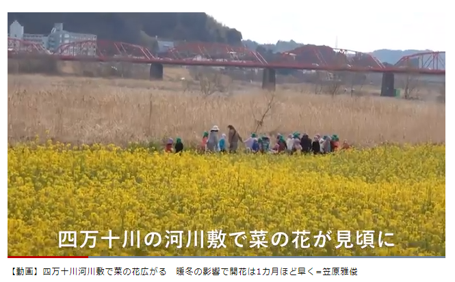 高知県4万10市入田の四万十川河川敷で黄色い花が湖のように広がる。暖冬の影響で開花は1カ月ほど早く、見ごろを迎えている。川沿いに続く約2キロのヤナギの周辺で、最盛期には自生している約1千万本の菜の花が咲く。菜の花の向こうに赤鉄橋が見える。青空が広がった2月25日、市内の園児約40人が菜の花の群生周辺で鬼ごっこや駆けっこをして遊んでいた。