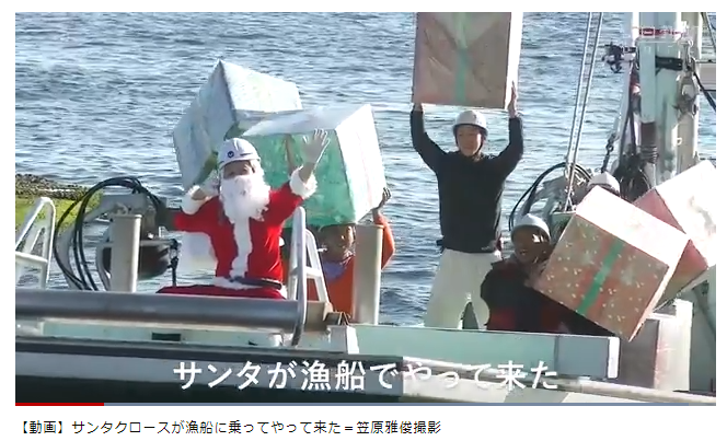 青い海からサンタがやって来た。クリスマスを前に高知県室戸市の椎名漁港に15日、トナカイのかわりに漁船に乗った白いひげのサンタクロースが上陸。出迎えた子どもたちにプレゼントを配った。「むろと廃校水族館」と「椎名大敷組合」が昨年始めた企画。先輩に室戸の海と人々の素晴らしさを聞いた若いサンタが「室戸に移住して漁師になりたい」と訪れたという設定だ。