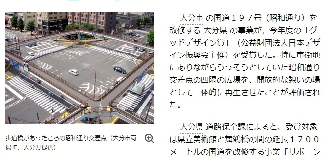 大分市の国道197号を改修する大分県の事業が、今年度の「グッドデザイン賞」を受賞した。特に市街地にありながらうっそうとしていた昭和通り交差点の四隅の広場を、開放的な憩いの場として一体的に再生させたことが評価された。