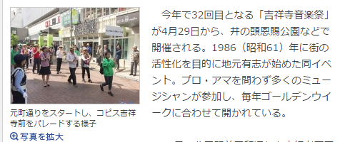 今年で32回目となる「吉祥寺音楽祭」が4月29日から、井の頭恩賜公園などで開催される。1986年に街の活性化を目的に地元有志が始めた同イベント。プロ・アマを問わず多くのミュージシャンが参加し、毎年ゴールデンウイークに合わせて開かれている。5月7日まで。