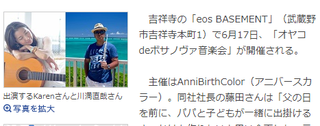 吉祥寺の「eosBASEMENT」で6月17日、「オヤコdeボサノヴァ音楽会」が開催される。主催はAnniBirthColor。同社社長の藤田さんは「父の日を前に、パパと子どもが一緒に出掛けるきっかけを作りたいと思い企画した。ライブハウスに行くような感覚で、親子で音楽を聴きに来てほしい」と話す。開催時間は10時~11時30分。料金は、大人=2,500円、子ども=1,000円。4歳未満で膝上鑑賞の子どもは無料。定員は30人。要事前予約。