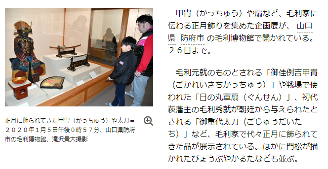 甲冑や扇など、毛利家に伝わる正月飾りを集めた企画展が、毛利博物館で開かれている。26日まで。毛利元就のものとされる「御佳例吉甲冑」や戦場で使われた「日の丸軍扇」、初代萩藩主の毛利秀就が朝廷から与えられたとされる「御重代太刀」など、毛利家で代々正月に飾られてきた品が展示されている。ほかに門松が描かれたびょうぶやかるたなども並ぶ。