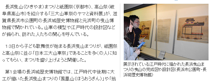 長浜曳山まつりと祇園祭、高山祭を紹介する「3大山車祭のヤマと資料展」が、長浜城歴史博物館と元浜町の曳山博物館で開かれている。山車の模型や江戸時代の設計図などが飾られ、訪れた人たちの関心を呼んでいる。長浜城歴史博物館は23日まで、曳山博物館は5月10日まで。