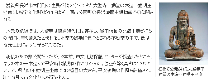 滋賀県長浜市大門町の住民が代々守ってきた大聖寺不動堂の木造不動明王坐像が11日から、同市公園町の長浜城歴史博物館で初公開される。公開は10月19日まで。午前9時~午後5時。