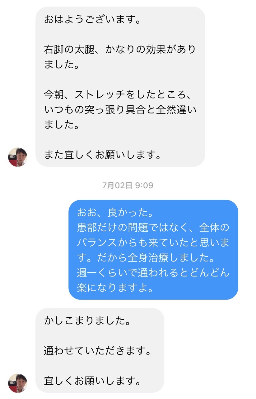 コンディション調整には、定期的にきたほうがいいですよと話して、毎週来ますということになりました。