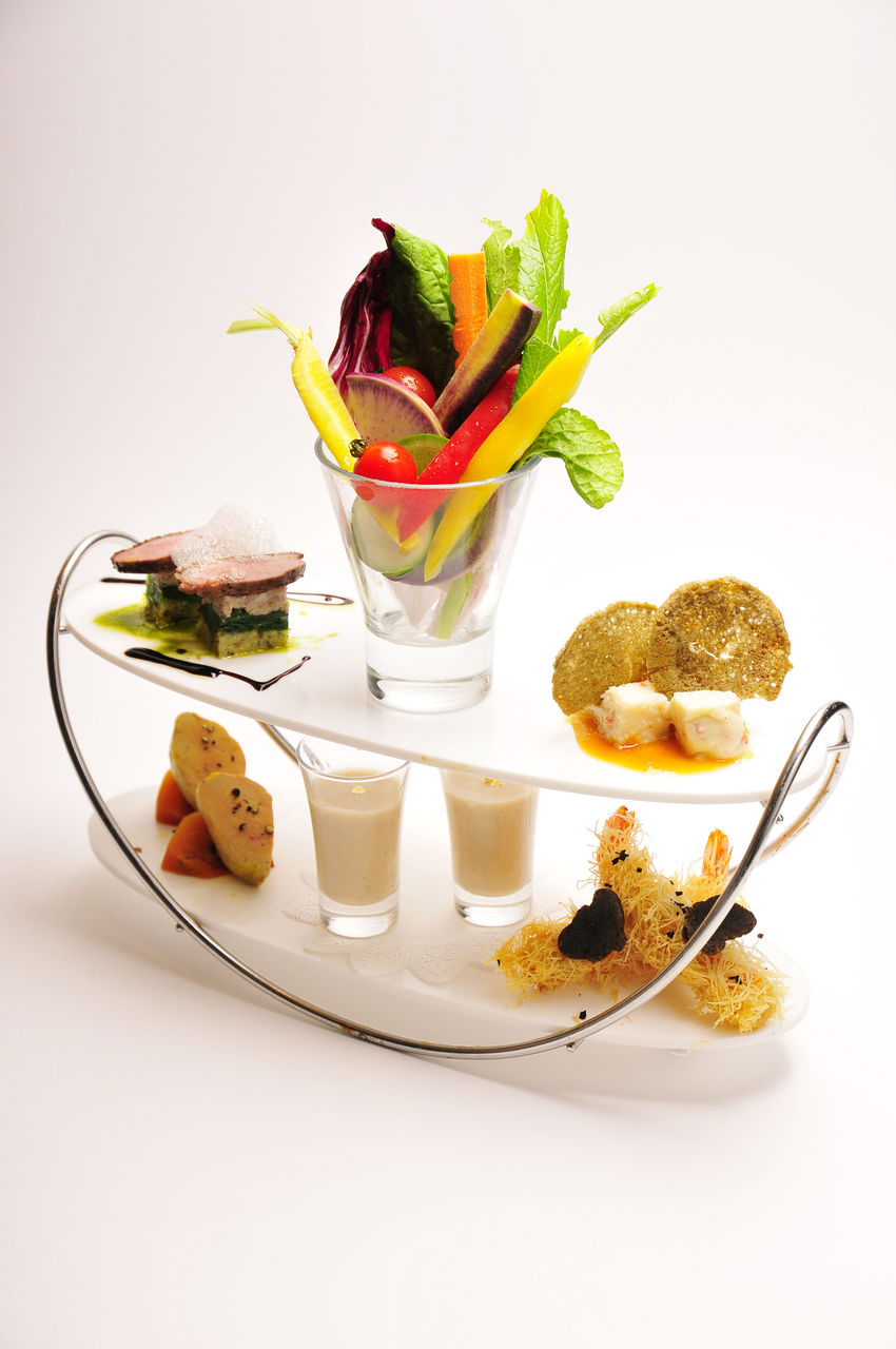 鴨スモークとカリフラワー、おいしい菜のミルフィーユ