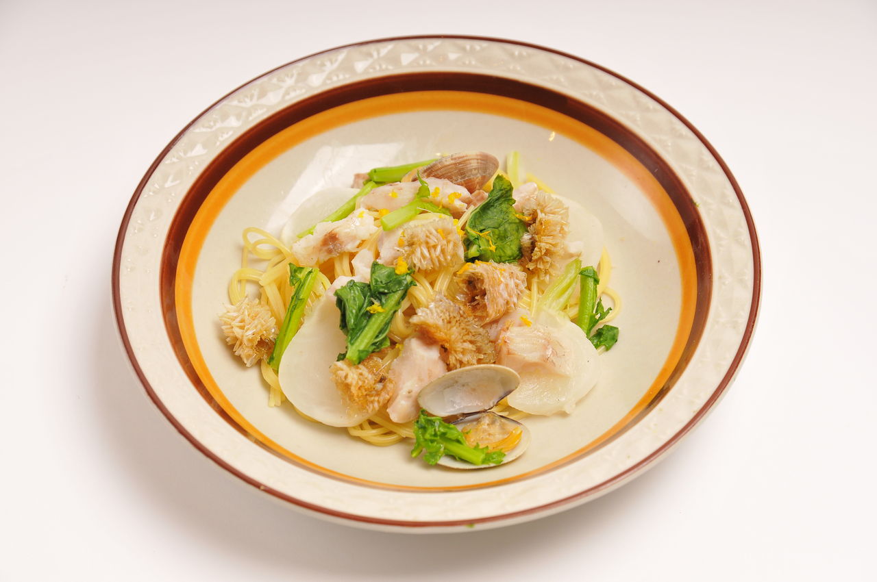 甘鯛と佐賀七山村産かぶのパスタ 柚子風味もちろん甘鯛もさばいてます。