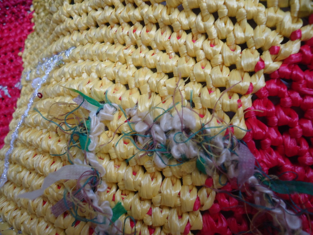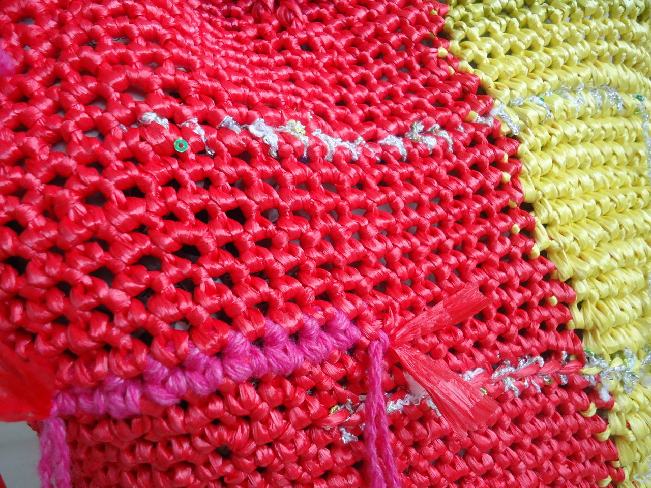 タコ糸使用で、鉢の底に合わせて細編みをグルグル、長編みでサイドを1段編んでそこからはネット編み。