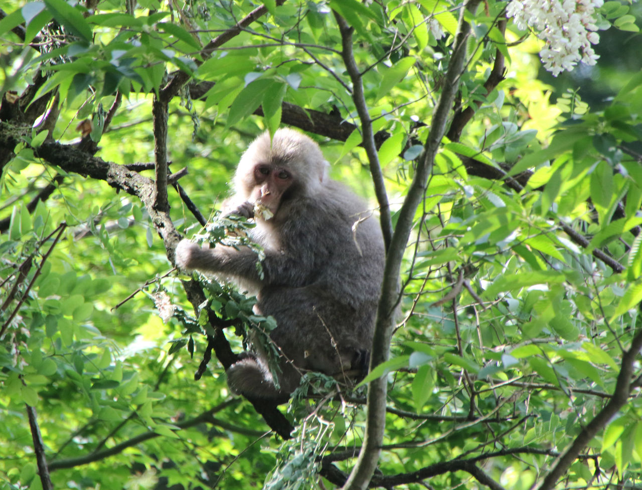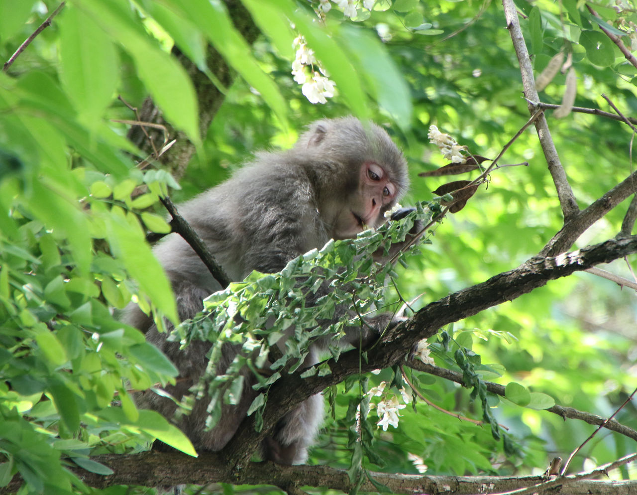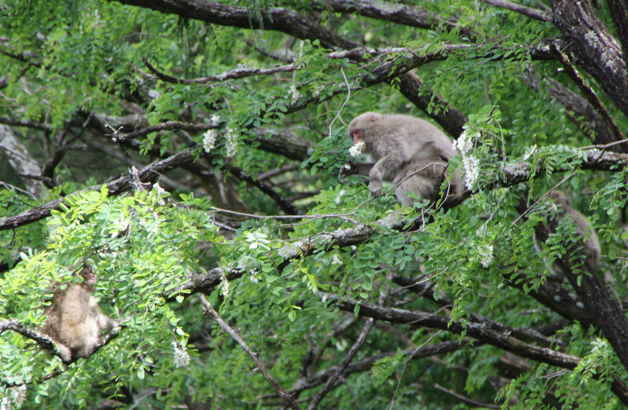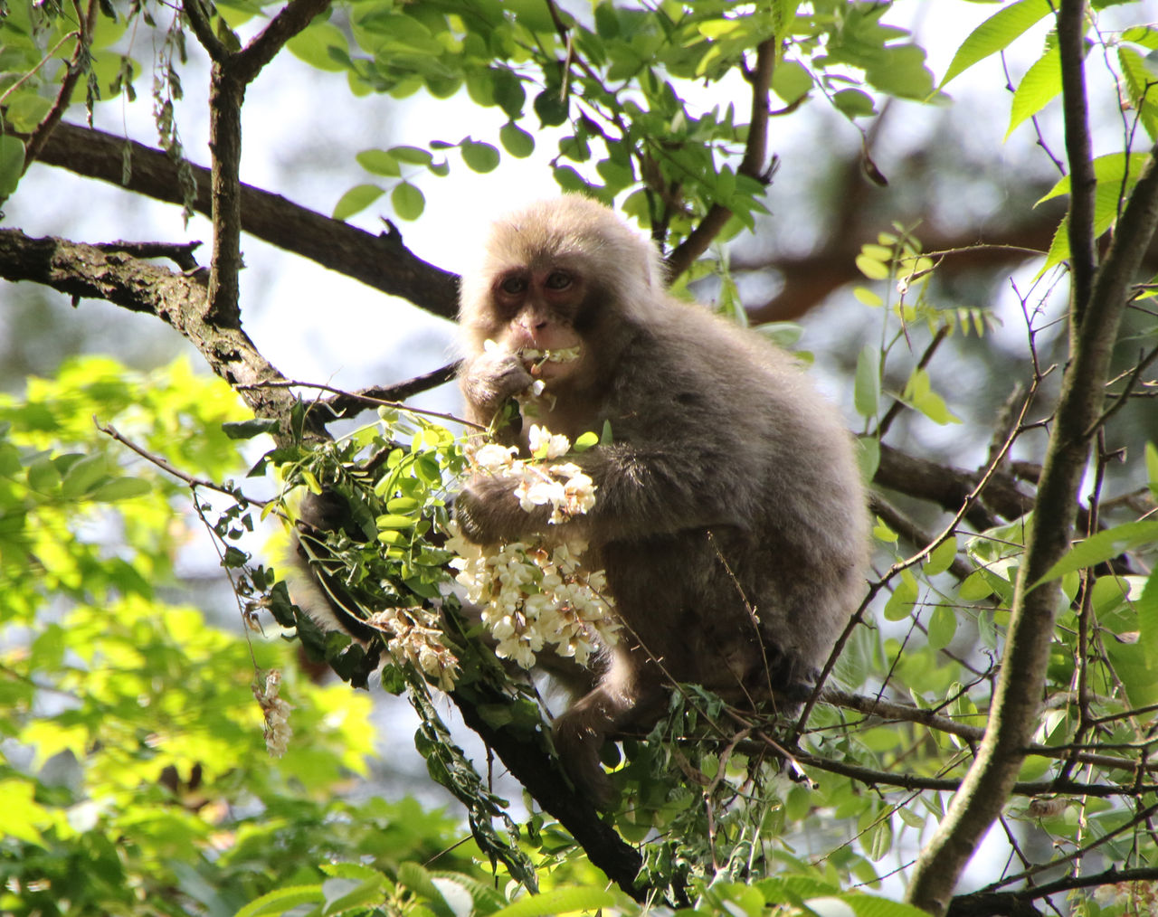 アカシア(正しくはニセアカシア)の甘い香りの季節です。この甘い香りに誘われるのはミツバチだけではありません。野生の猿にとっては大好物のようで、毎年必ず食べに来る所があります。樹の下には県道幸助線(大平街道)が通り、たまに車が通るのですがお構いなしに食べております。撮影をしようと車から降りると警戒してたちまち木から下りてしまい、撮影は難しいです。野生猿はカメラ目線なんかくれませんね。