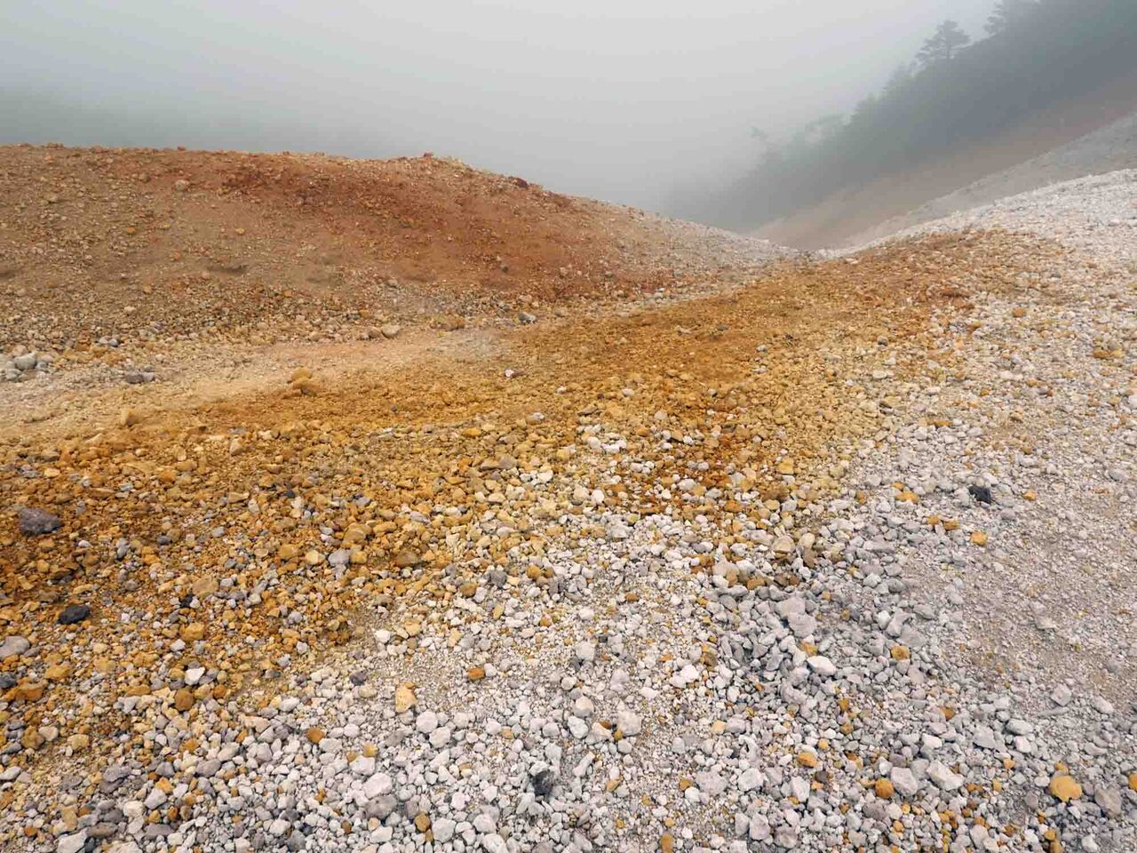帰りは赤岩の頭から樹林帯へ 火山であったため鉄分、硫黄分の層がはっきり分かる。