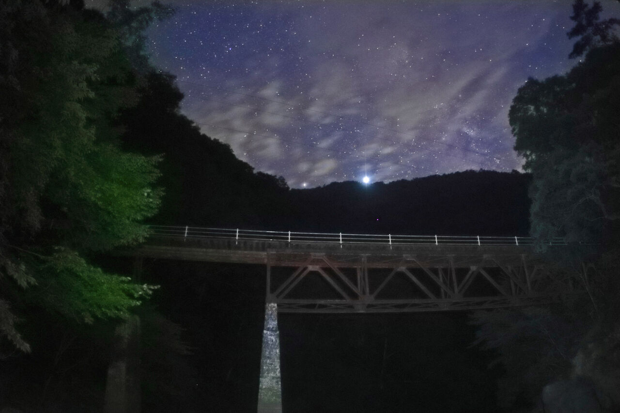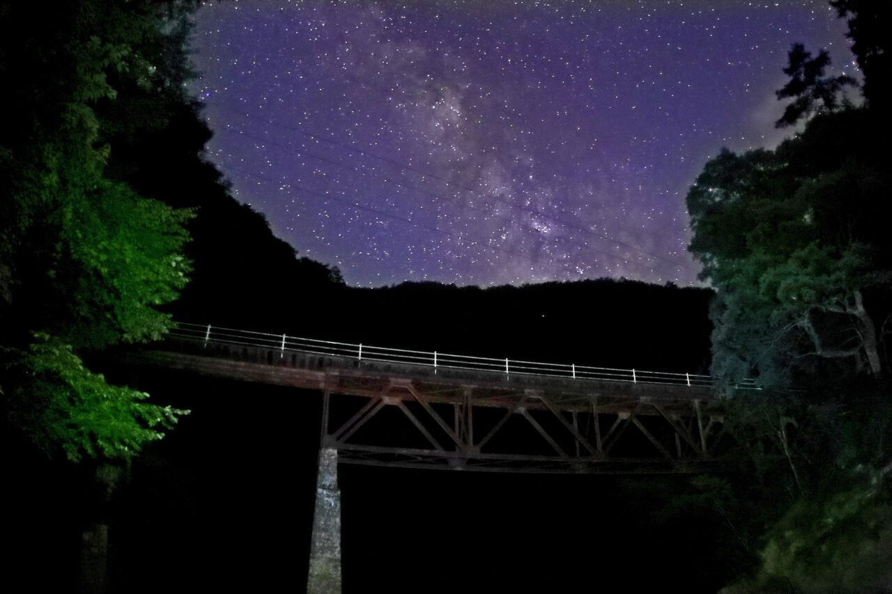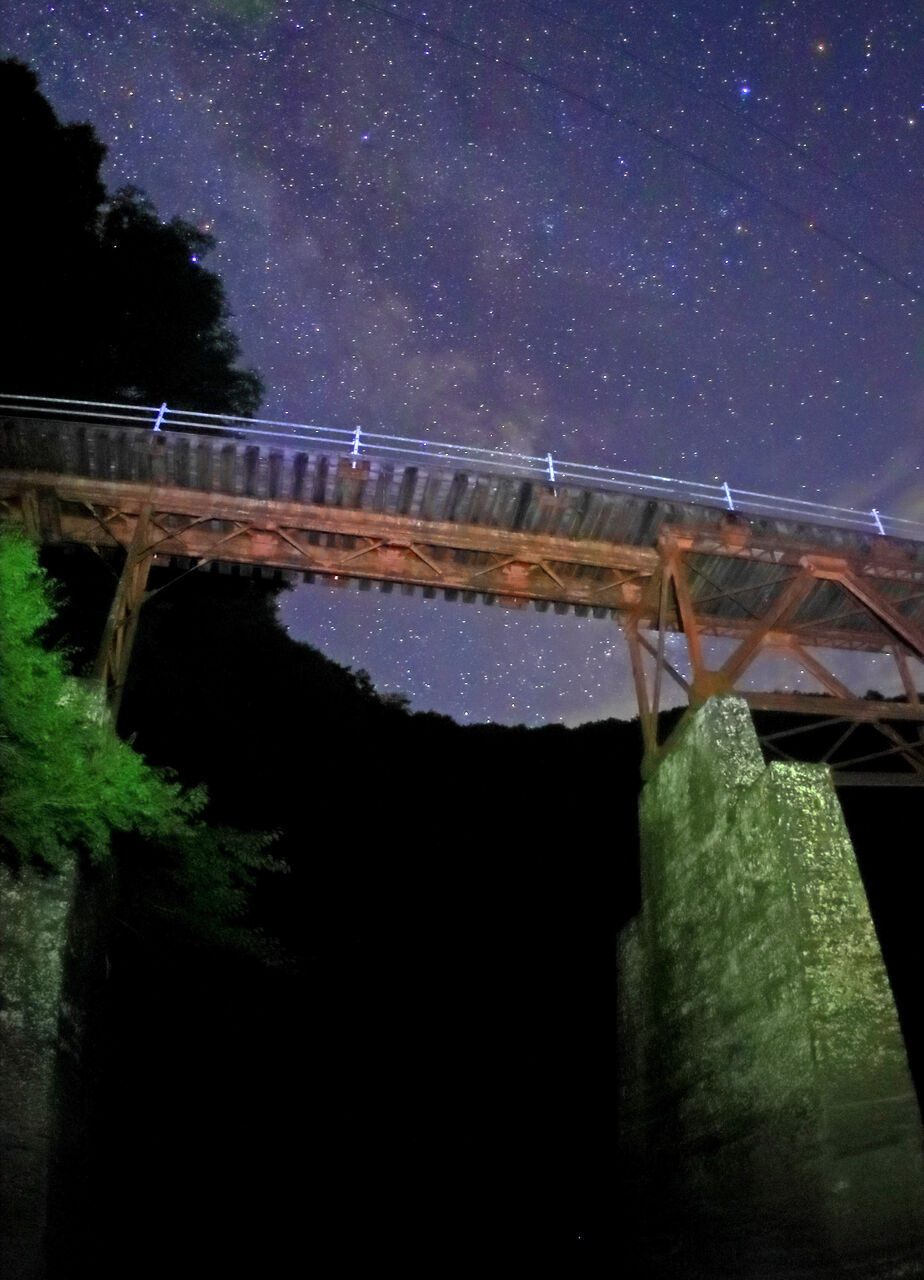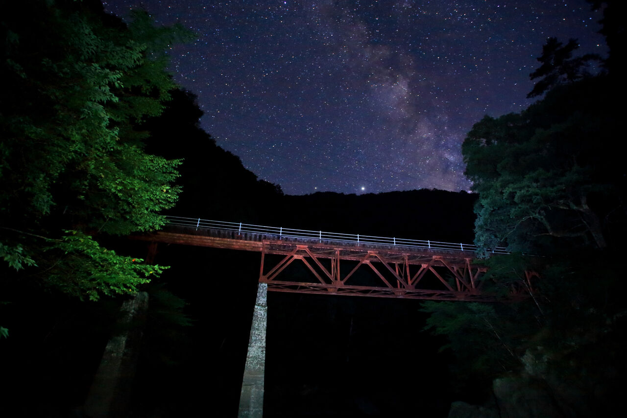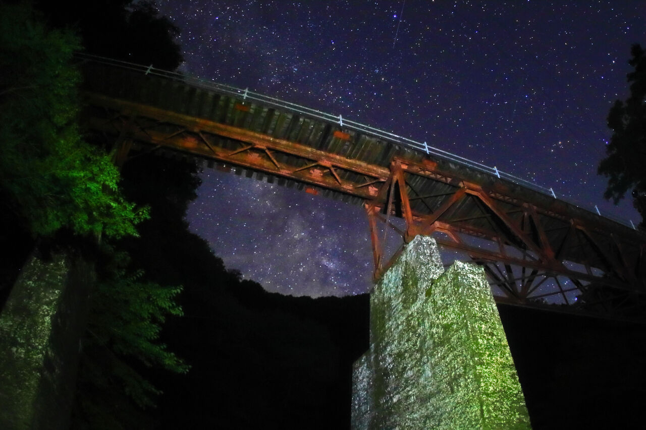 2017年に遠山森林鉄が林業遺産に登録され、昨年見学会に行った際、長瀞橋の遠山川河原まで下りて見上げたところ、実に味わいのある橋で感動しました。南が開けているため、この橋の上に天の川が現われると直感し、いつか撮影に行こうとチャンスを狙っておりました。梨元の始発点から遠山川に沿って約5.5km奥に入ったところにあり、車で600m程手前の須沢集落跡まで入れます。今は3、4軒あった家は廃墟となっております。そこに車を駐車し、軌道跡を明るい内に歩いて行き、橋の下の河原に下りて暗くなるのを一人待ちました。途中、下栗地区から流れ落ちる沢が大雨で崩落し、大岩を越えねばならない所があります。帰りはヘッドランプ頼りに相当な注意が必要でした。熊避けに爆竹、ロケット花火で威嚇しましたが、橋の上流部の柿の島地籍も空き家となってしまっており、廃墟となった近くに行くには度胸が必用です。