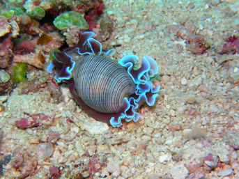 【特徴】大型の貝殻は薄く、殻表には多数の黒色螺帯がある。淡褐色の縦線は不透明で、個体によってはほとんど見えないこともある。貝殻の中に格納しきれない大きな軟体部は褐色をおびたピンク色で、フリル状の円縁は青白色で蛍光を発する。
