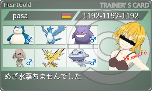 メモ:バンギラス来ないでしょうと完全に切った選出をしたら1T目にバンギラス出てきて勝負は決していた。yasuさん1192さんにその話をしたらそういうゲームじゃないからwと言われた。未だに金銀の対戦をよくわかっていない。