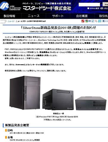 表題の通り。詳しくはこちら→SilverStone新商品発表会2011秋」開催のお知らせ上記ページを見る限り、見た目的には当たり前な感じの新製品ばかりですね〜。