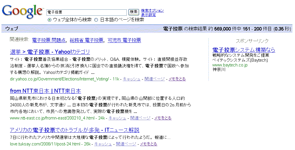 さて、さきほど同様の検索行為を試してみた。なんと、驚いたことに、「電子投票が導入された未来予想図」の表示が復帰していたのだ。図1は、検索ボックスに何を入れたのかが分かるものであり、図2は、187番目に表示されている様子が分かるものである。