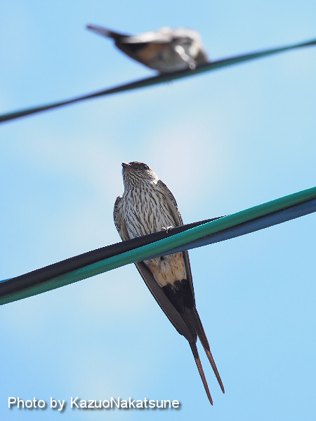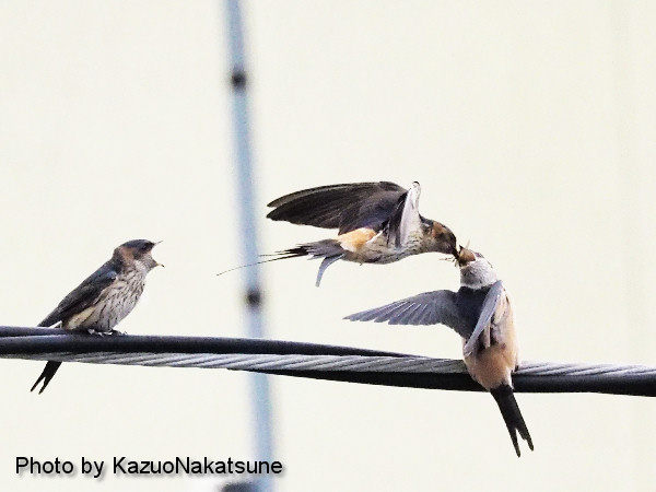 家の前の電線で尾っぽが短い雛たちが親鳥に餌を運んでもらう光景。