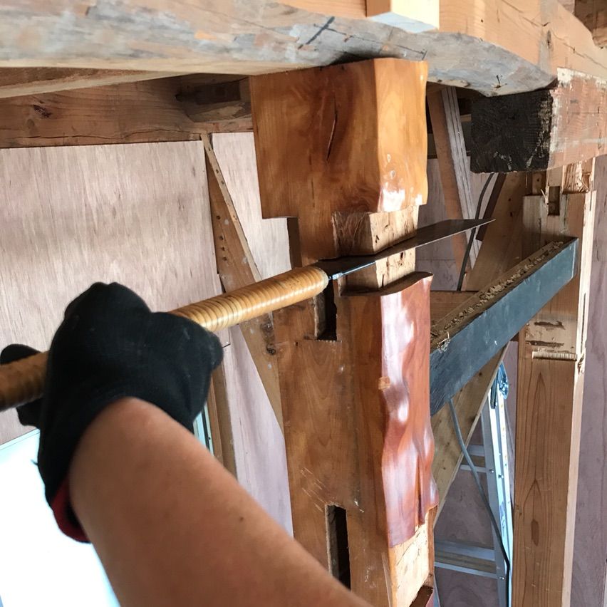 当然そうしてるものだと思ってギコギコやってたんですけど、そんな私に全く気づいてない設計士は、横に押してだるま落としみたいに宙ぶらりんの柱を抜こうとしたんですねぇ。それはまるで相撲の稽古で柱に張り手をするように。そして抜けた瞬間嫌な予感的中。柱が頭部に直撃して血だらけになり救急車で病院送りです。