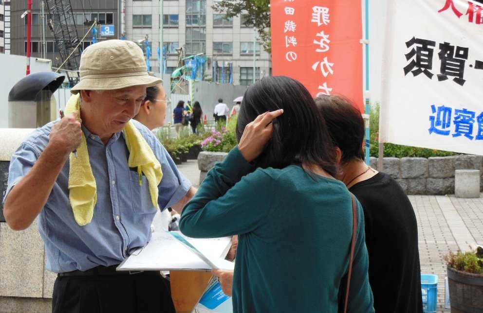 写真の十亀さんは、タオルを首にかけての奮闘でした。ずいぶん通行人の足を止めて、話し込み、署名を集めていました。