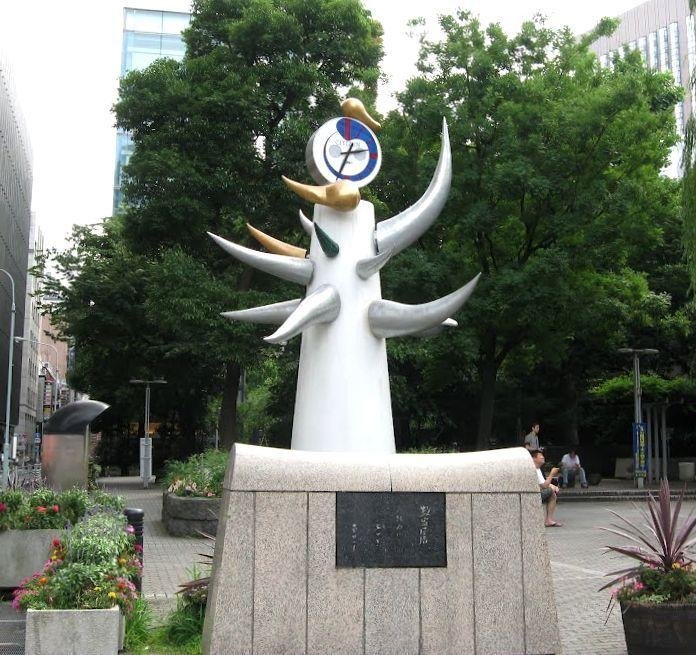 ご存知の方も多いと思いますが、戦後間もない頃、好評を博したラジオドラマ『君の名は』の舞台になったところであり、作者の菊田一夫の、「数寄屋橋 此処に ありき」と刻まれた石碑があるところです。また、「若い時計台」と名づけられた岡本太郎作製のオブジェがあったりして、結構な観光「名所」となっています。