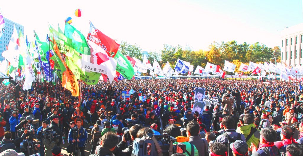 いよいよソウル市庁舎前広場で開かれる全国労働者大会です。会場へと向かっている最中にも労働組合のデモ隊列と遭遇しましたが、巨大なデモ隊列が会場に入っていく光景は圧巻です。目の前がたくさんのデモ隊と労組旗で埋め尽くされていく光景を見ていると、世界中で起きている革命情勢を肌で感じることができました。