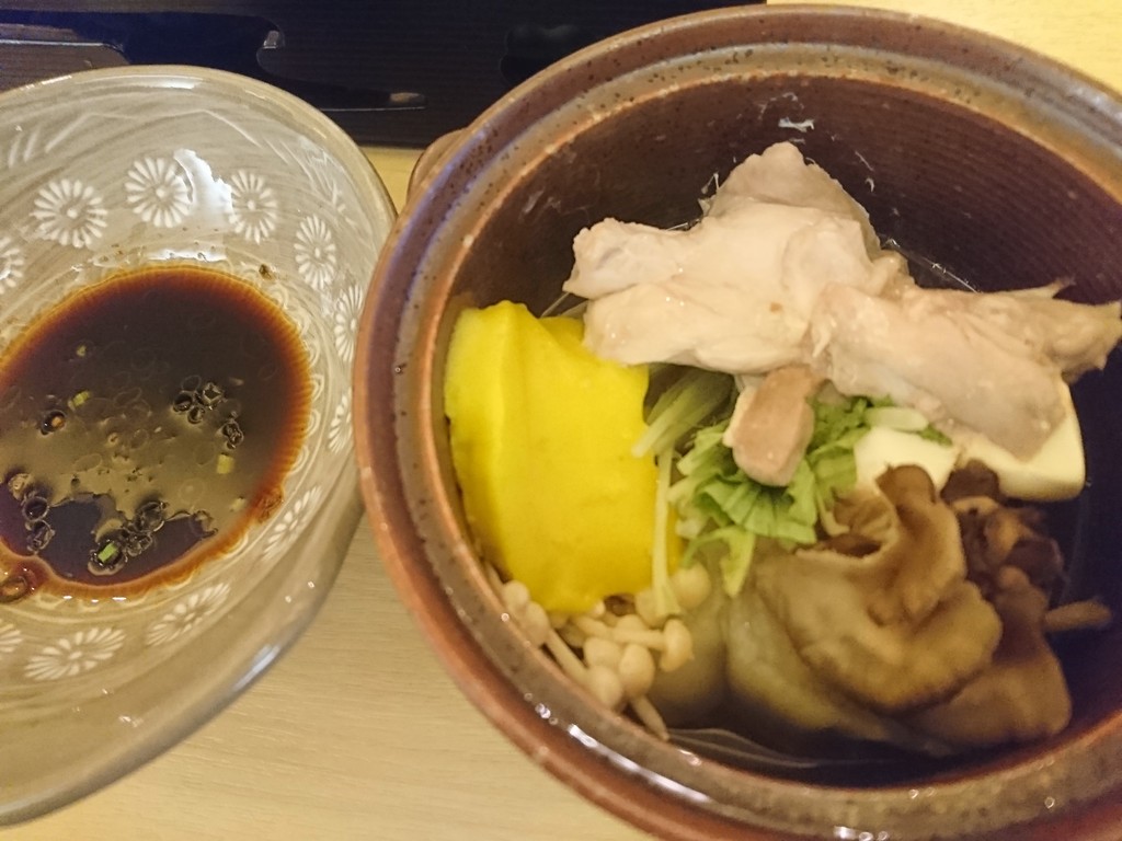 宴会だったから、造りとか揚げ物とかいろいろ出てきて、とても楽しかったよ。豚肉と豆腐と季節の野菜の煮物は、ポン酢で食べると爽やかにいただけるんだ。