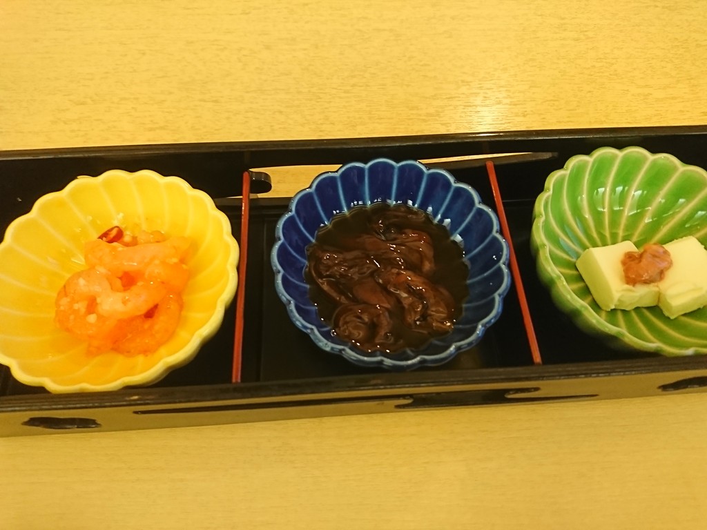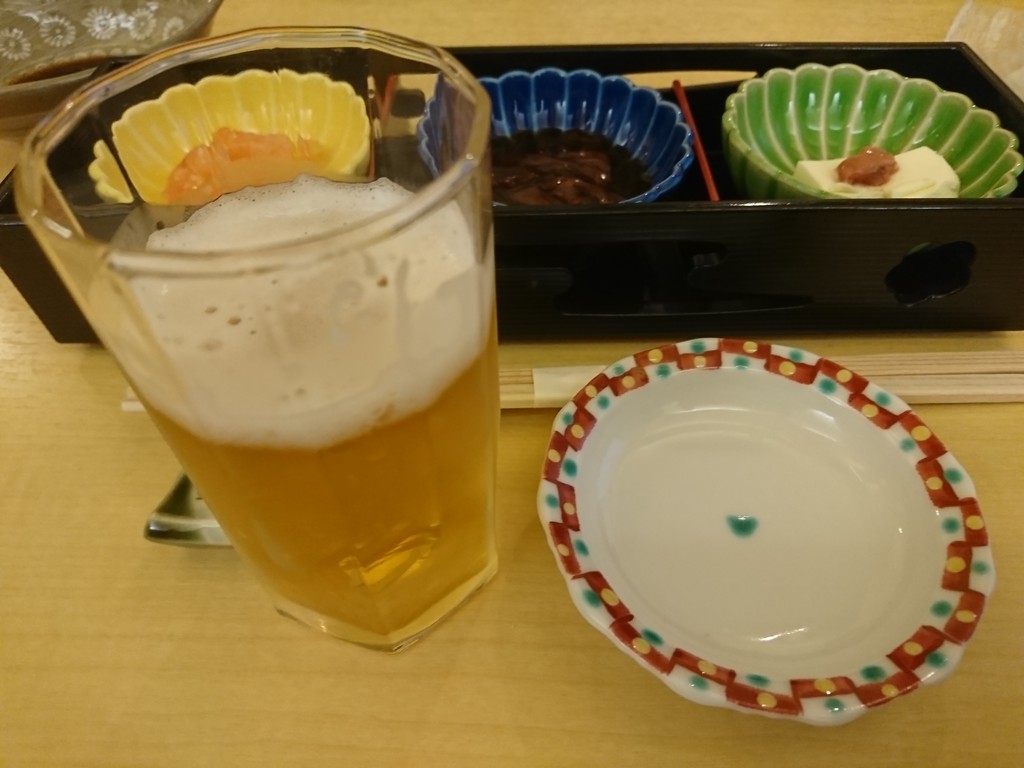 まずはお通し。海老の味噌和え、ホタルイカの沖漬け、胡麻豆腐(だったかな?)の3品。これだけでも、たっぷりビールが飲めるのだった。