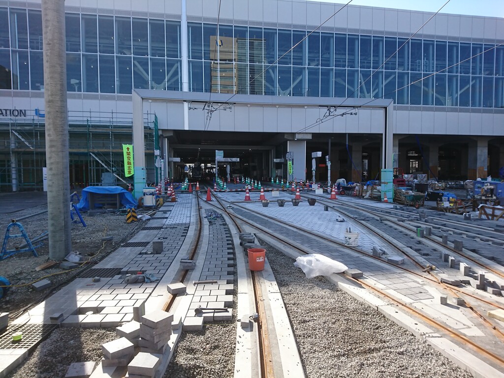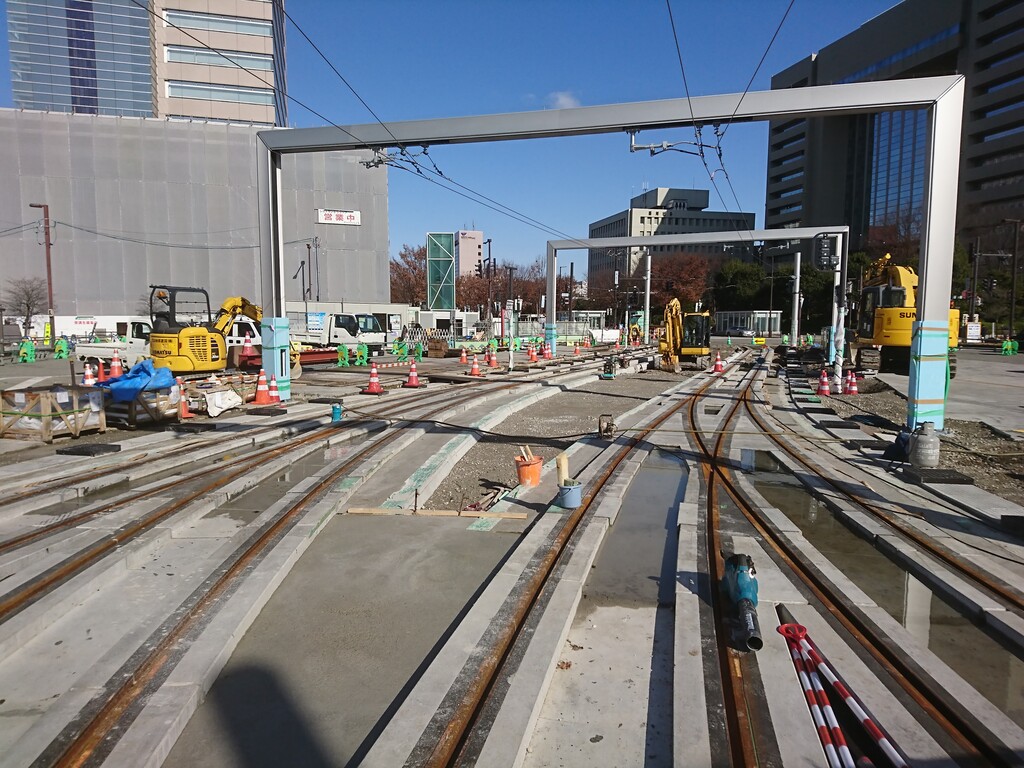 来年の3月には、市内電車とライトレールがつながるんだよね。ただいま、絶賛準備中。線路をつなぐ工事は、おおむね終わっているみたいだよ。