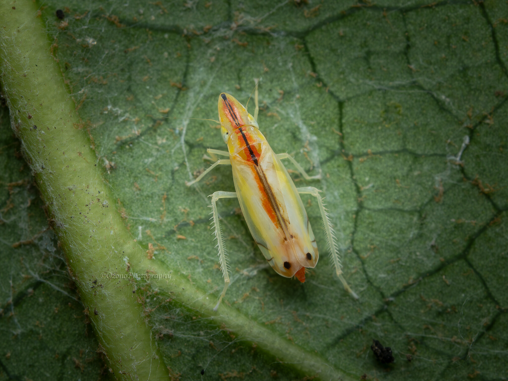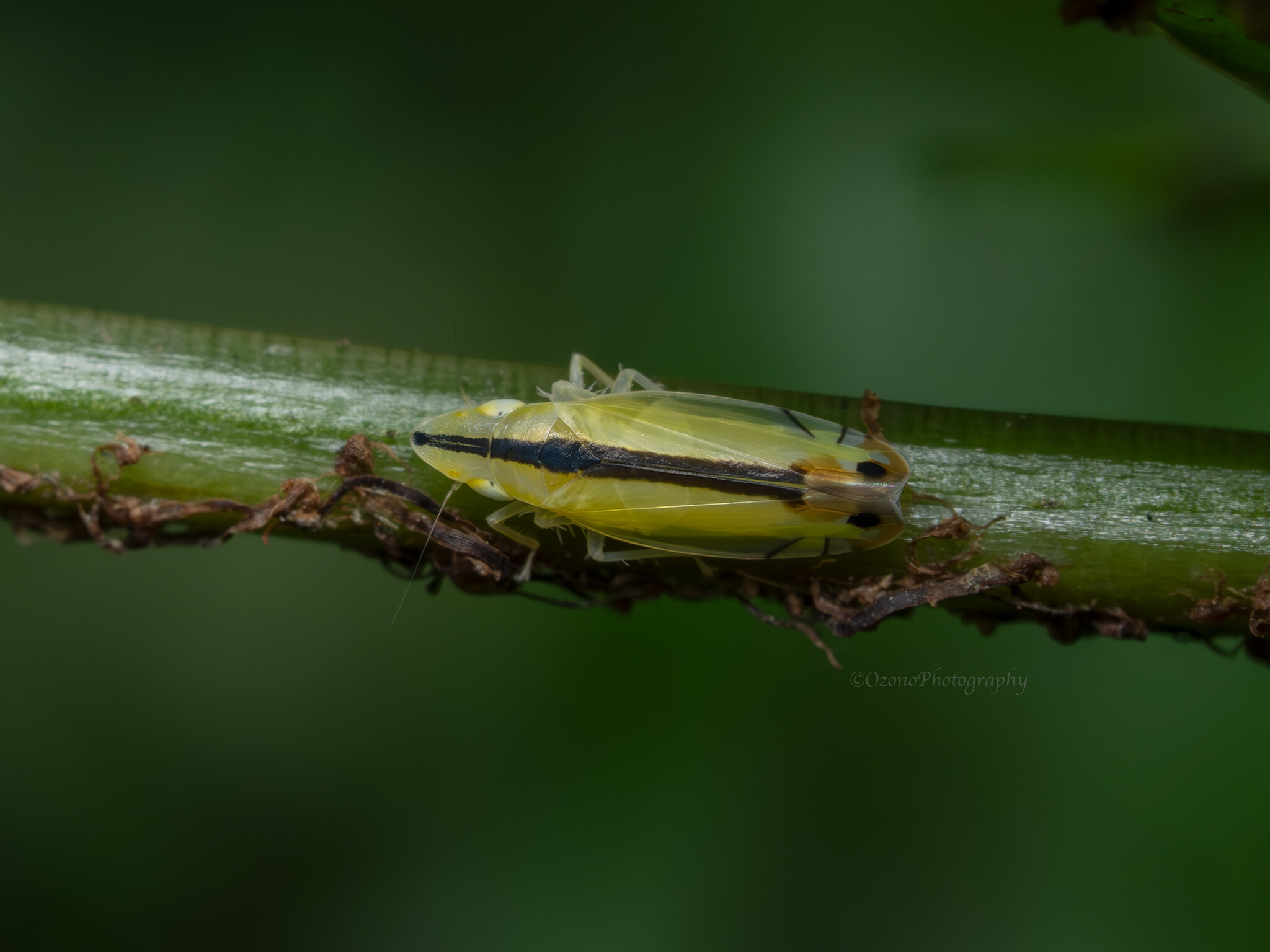 撮影していると画面の中に乱入者が。クロスジホソサジヨコバイ、絶体絶命!?