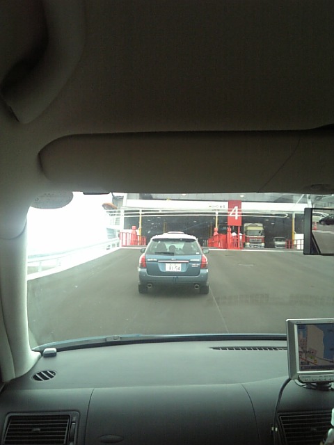 何時に出航になるか判らないので、ターミナルの中をうろうろしていましたが、そのうち専用ゲートに車が並び始めたので、ウチも並ぶ事に。